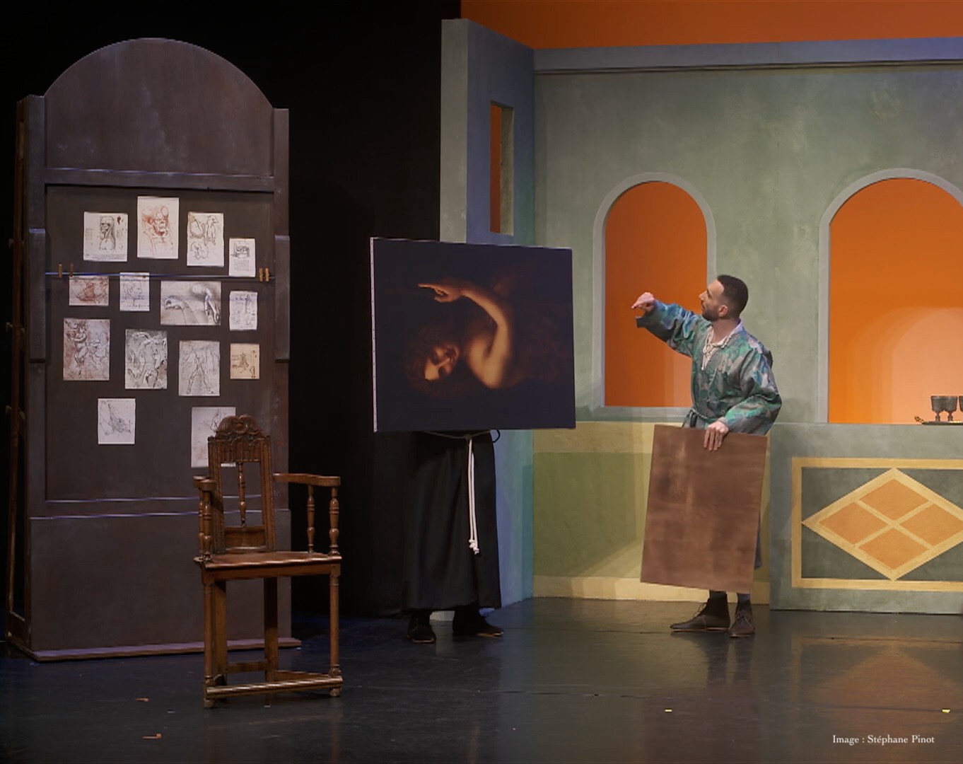 Mais comment la faire poser sans qu’elle ne le remarque ?D’autant que le Pape, en visite surprise, a décidé de condamner tous les artistes qui peignent autre chose que des figures religieuses…Du décalage, du second degré, de la parodie… dans la veine de l’humour de « Spamalot » des Monty Python et de « Kaamelott » d’Alexandre Astier.