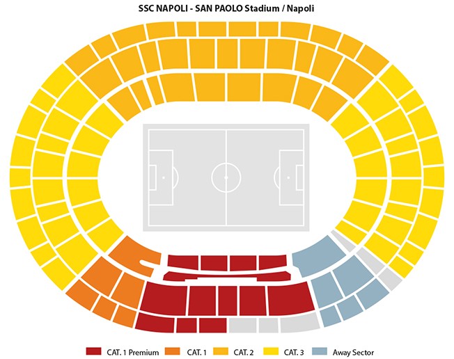 CATÉGORIES : Catégorie Premium : Tribune Latérale Centrale Posillipo - en rouge foncé sur le plan Catégorie 1 :Tribune Latérale Standard Nisida - en orange sur le plan Catégorie 2 :Tribune Latérale Standard - en jaune foncé sur le plan Catégorie 3 :Virage Standard - en jaune sur le plan
